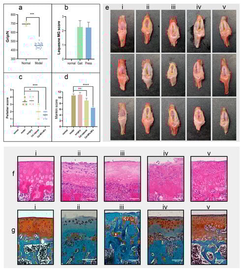 Study of the drug delivery performance in the OA rat model; (a) Analysis of hind limb grip of rats before administrating one-way ANOVA between the normally fed and model groups (p < 0.001); (b) The behavioral Lequesne MG score of OA model rats (including gait and knee joint compressions); 0 indicates the slightest degree without pathological changes, and 4 indicates the most severe pathological changes; (c) After treatment, the gross Pelletier score of the knee joint (corresponding to (e)), 0 was the slightest without lesion, 5 was the most serious, with Dunnett multiple comparisons (* means p < 0.05, *** means p < 0.001); (d) Combined with the HE section and saffron fast green staining section ((corresponding to (f,g)), according to the degree of pathological changes of Mankin score. A 0 score was the lightest without pathological changes, with 15 indicating that the lesion was the most serious, with the Dunnett multiple comparisons (** means p < 0.01, **** means p < 0.0001); (e) Gross view of cartilage (i, the normal group; ii, the model group; iii, the model sham operation group; iv, positive control group; v, the Cel-NPs-NFs treatment group); (f) HE section (scale: 100 µm); (g) Fuchsin fast green staining section (scale: 100 µm).