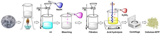 The extraction of cellulose-WTP particles from WTP was carried out based on the procedure outlined by Danial et al. [23] and Sheltami et al. [24], wherein the basic and acidic hydrolysis methods were followed. Briefly, the collected WTP was shredded into small pieces and boiled for 6 h, followed by the addition of distilled water periodically. It was then ground to obtain a slurry and filtered and rinsed several times with distilled water. Afterwards, the slurry was boiled again and treated with 5% sodium hydroxide (w/v), followed by the treatment with 2% sodium hypochlorite (v/v). Finally, the slurry was filtered, and the cellulose material was washed several times with deionized water until the pH became neutral. Thereafter, the pre-treated cellulose was constantly stirred for 1 h at 45 °C and 250 rpm on a hotplate with a magnetic stirrer (MS-H380-Pro DLAB, Rowland St. City of Industry, CA, USA) with the addition of 60% (v/v) H2SO4 acid solution, where the pretreated solution to acid ratio was 1:2 (v/v). The mixture was diluted with deionized water and then centrifuged at 2000 rpm (LC-8, Benchmark Scientific, Sayreville, NJ, USA) for 1 h to eliminate the spent acid, and this process was repeated three times. Subsequently, the suspension was dialyzed with deionized water until it attained a constant pH, and it was finally dried in an oven at 70 °C overnight. The overall process is summarized in Figure 1.