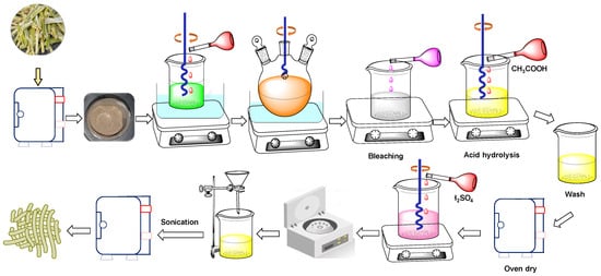 The cellulose-SCB particles were extracted from the SCB following the delignification and bleaching, as previously discussed by Rashid et al. [8] and Evans et al. [25]. At first, the SCB was washed with deionized water, and then, it was sun-dried. Afterwards, it was crushed into small pieces using a commercial blender and sieved through double mesh sieves. The SCB powder was dried in an oven for 5 h at 105 °C. Afterwards, about 30 g of the bagasse powder was mixed with 300 mL of 6% HNO3 acid (w/v), and it was continuously stirred for 2 h at 80 °C and 250 rpm on a hotplate with a magnetic stirrer. The mixture was washed several times with deionized water until a neutral pH was achieved, and it was refluxed in the presence of 200 mL of 1% NaOH at 100 °C for 2 h on a magnetic hotplate with constant stirring at 250 rpm. Thereafter, the mixture was subsequently washed with deionized water and bleached with 100 mL of 0.735% sodium hypochlorite (w/v). The cellulosic extract was again subjected to acetic acid hydrolysis at 80 °C for 2 h. The mixture was further washed with deionized water until attaining a neutral pH, and finally, the extracted material was dried in an oven (ON-01E Jeio Tech, Seoul, Korea) at 80 °C. The pre-treated cellulose was hydrolyzed with 32% of the H2SO4 acid (w/v) under constant stirring for 24 h at 250 rpm and room temperature, where the cellulose to dilute acid ratio was 1:25 (w/v). This reaction was quenched by adding 10-fold more deionized water to the reaction mixture. The solution was centrifuged three times at 10,000 rpm for 15 min to eliminate the acid solution. The supernatant was discarded, and the cellulosic precipitate was redistributed in deionized water. Afterwards, it was subsequently dialyzed with deionized water, and the cellulose crystal was homogenized by sonicating the colloidal suspension for 1 h using a WD-9415A digital ultrasonic cleaner (Beijing, China). The generated crystals were further centrifuged at 6000 rpm for 30 min and kept for 24 h to settle the water, which was further replaced with acetone, followed by centrifugation at 6000 rpm for 30 min, and finally dried in an oven at 70 °C overnight. The overall preparation process is briefly depicted in Figure 2.
