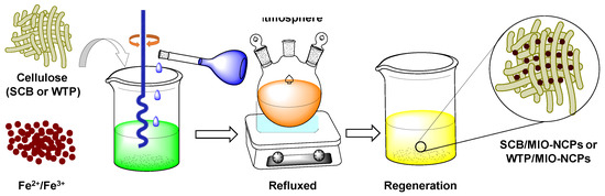 The preparation of WTP/MIO-NCPs and SCB/MIO-NCPs was carried out based on the partially modified method of Rashid et al. [18], and the overall protocol is summarized in Figure 3. Briefly, 1.0 g of cellulose particles obtained from the WTP and SCB were separately transferred into a three-necked, round-bottomed flask that was dipped in an oil bath and dispersed in 50 mL of deionized water by magnetic stirring at 400 rpm for 30 min. The dispersion mixture was heated for 20 min at 60 °C, and then, 0.2 g of FeSO4·7H2O and FeCl3 (1:2 molar ratio) were added. The mixture was continuously stirred at 250 rpm for another 10–20 min, and 25% of the NH4OH solution was added. The reaction was continued in an inert atmosphere for more than two hours. At the end of the reaction, a black-colored composite material was precipitated, which was further magnetically separated, washed with deionized water, and then dried in an oven at 50 °C for 3 h.