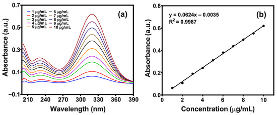 Linearity was established by the least squares linear regression analysis of the calibration curve. Initially, a standard stock solution (100 μg/mL) was prepared by adding 10 mg of metronidazole drug to 100 mL of buffer solution (pH 7.4). Then, a series of standard solutions (1–10 μg/mL) were prepared by diluting the stock solution, and the absorbance for each solution was measured at 320 nm. Afterwards, a standard calibration curve was drawn by plotting a graph of absorbance vs. concentration (Figure 4). The values of the correlation coefficient (R2) and the standard regression equation were found to be 0.9987 and y = 0.0624x – 0.0035, respectively.
