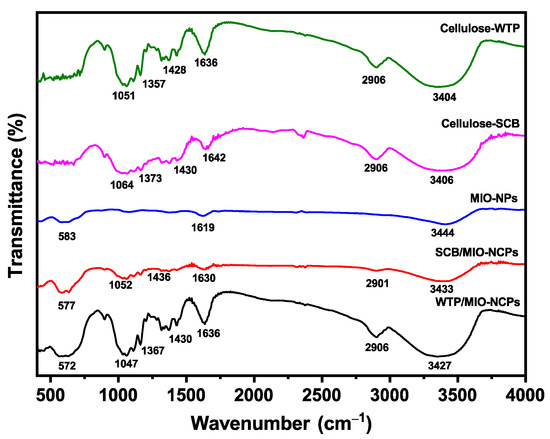 FTIR is one of the most commonly used instrumental techniques for the identification of the different functional groups present in the nanocomposites, and the FTIR spectra of the cellulose, NPs, and NCPs are displayed in Figure 5. The FTIR spectra of cellulose obtained from the WTP and SCB exhibited characteristic bands at 3406 cm−1 (2998–3600 cm−1), indicating the tensile vibrations of O–H groups, while the absorption peaks near 1430 cm−1, 1373 cm−1, and 1064 cm−1 revealed the presence of the tensile and flexural vibrations of the C–H group and the tensile vibration of the C–O group, respectively [14]. The signal around 1642 cm−1 appeared due to the cumulative vibration of the O–H bending of the absorbed water [10]. The bands at 1064 cm−1 and 897 cm−1 were attributed to the skeletal vibration of the –C–O–C– pyranose ring and the symmetric stretching of glycosidic linkages between the glucose units [10,13,25]. The absorption peaks that appeared in the pure cellulose spectra were also noticed in the FTIR spectra of the WTP/MIO-NCPS and SCB/MIO-NCPs. It is noteworthy that all the spectra were mostly similar except for some additional signals or shifts in the original peak position. The signal near 2906 cm−1 in the spectrum of cellulose, WTP/MIO-NCPS, and SCB/MIO-NCPs originated from the C–H stretching and rocking vibrations of the methylene groups (–CH2) [13]. In the FTIR spectra of the MIO-NCPs, WTP/MIO-NCPS, and SCB/MIO-NCPs, the presence of absorption bands near 583 cm−1, 577 cm−1, and 572 cm−1, respectively, indicated the flexural vibrations of Fe–O bonds in the partially disordered MIO particles [13,14]. This finding revealed the impregnation of MIO-NPs in the cellulose matrix during the formation of NCPs. Similar types of absorption bands for cellulose were previously noticed by Lu et al. [1], Rashid et al. [8], Rabbi et al. [10], Azizi [14], and Khodaei et al. [32] while investigating the structure of metal-incorporated cellulose NCPs.