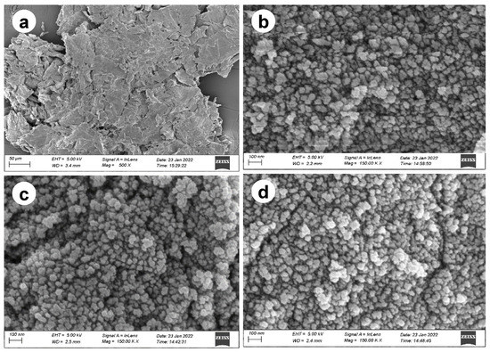 The SEM images of the cellulose, MIO-NPs, WTP/MIO-NCPs, and SCB/MIO-NCPs are shown in Figure 6. The aggregation of cellulose was observed in the microscopic image (Figure 6a), which might be due to the polar nature of cellulose particles or the gradual evaporation of the dispersion medium, which brought the single cellulose crystallites closer and facilitated the accumulation through hydrogen bonds [13,33,34,35]. The morphology of the synthesized MIO-NPs (Figure 6b) was found to be irregularly spherical and agglomerated in nature, as previously mentioned in similar articles [36,37]. As the MIO-NPs showed magnetic properties, they could combine to produce aggregated particles. Moreover, this phenomenon might occur due to the steric effect ascribed to the interaction between the magnetic NPs [36,37]. In this study, the WTP/MIO-NCPs and SCB/MIO-NCPs were prepared by the in situ co-precipitation of cellulose particles and MIO-NPs in a basic medium, where the MIO-NPs were trapped in the cellulose matrix. Like the MIO-NPs, both the SCB/MIO-NCPs and the WTP/MIO-NCPs showed positive responses under the influence of an external magnetic field, which confirmed the magnetic property of the NCPs and resulted in agglomerated spherical-like porous particles (Figure 6c,d). However, the cellulose particles were enriched with hydroxyl groups, and these hydroxyl groups were expected to take part in the formation of cellulose/MIO hydrogen bonds [8].
