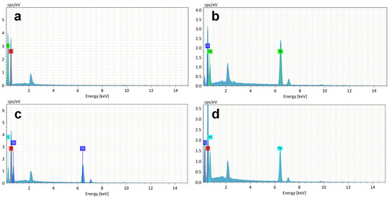 The formation of MIO-NPs, WTP/MIO-NCPs, and SCB/MIO-NCPs was investigated by EDX analysis, and the relative elemental compositions (C, O, and Fe) are presented in Figure 7. In cellulose, the presence of carbon (C) and oxygen (O) was confirmed by the EDX analysis (Figure 7a). The sharp peaks at 6.4 keV and 0.5 keV in the EDX spectrum indicated the existence of elemental iron (Fe) and oxygen (O), respectively, for the MIO-NPs (Figure 7b) [36]. Similarly, the presence of intense peaks for elemental C, O, and Fe in Figure 7c,d confirmed the insertion of MIO-NPs into the cellulose matrix and the formation of SCB/MIO-NCPs and WTP/MIO-NCPs.