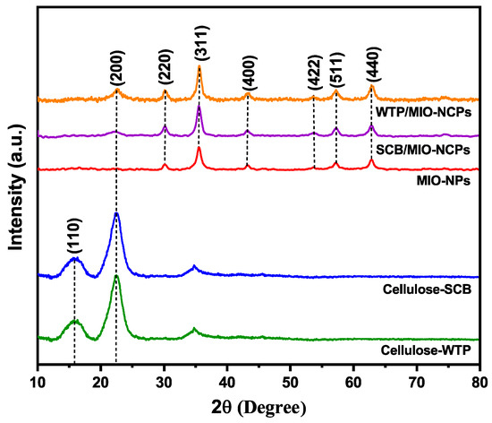 XRD analysis was employed to analyze the crystalline structure of the cellulose-WTP, cellulose-SCB, MIO-NPs, WTP/MIO-NCPs, and SCB/MIO-NCPs. In Figure 8, the cellulose particles exhibit two characteristic diffraction peaks at 16.2° and 22.5° for the (110) and (200) planes of the crystalline cellulose structure [1]. More specifically, the highest diffraction peak at 22.5° corresponds to the crystalline structure of cellulose I [23], whereas the low diffraction peak at 16.2° (near 18°) refers to the amorphous background [24]. The figure also showed the XRD pattern of the MIO-NPs, which had five distinct signals at 30.24°, 35.49°, 43.32°, 57.12°, and 62.79° for the corresponding (220), (311), (400), (511), and (440) planes, respectively. These diffraction signals were consistent with the JCPDS card no. 19–0629, which revealed that the synthesized MIO-NPs were crystalline [36]. Moreover, the absence of impurity phase peaks in the XRD spectrum indicated the single-phase structural nature and purity of the NPs, which had previously been reported in other similar studies [2,14,38]. The XRD peaks of WTP/MIO-NCPs and SCB/WTP-NCPs exhibited similar diffraction patterns for the cellulose and MIO-NPs, indicating that the MIO-NPs were anchored in the cellulose matrix and retained their phase properties [1]. It is notable that the diffraction signals in both the WTP/MIO-NCPs and the SCB/WTP-NCPs due to crystalline cellulose were not prominent and almost disappeared because of the existence of the hydrogen bonds and electrostatic interaction between the MIO-NPs and the cellulose particles that disrupt the crystal structure of cellulose. In addition, the poor diffraction signals may be due to the presence of MIO-NPs with a lower content [8]. Similar observations had also previously been reported by other researchers while preparing MIO-NPs-incorporated cellulose NCPs [1,38]. The average crystal size of the NPs and NCPs was calculated based on the full-width half maximum of the diffraction peaks by using the Debye–Scherrer formula [36,39]. The average crystallite size of the MIO-NPs, SCB/MIO-NCPs, and WTP/MIO-NCPs was obtained as 12.38 nm, 10.85 nm, and 11.47 nm, respectively, which was in line with the mean size of the nanocomposite (17 nm) and the MIO-NPs (28 nm), reported in the study of Azizi [14]. Equivalently, 15.28 nm, 7.21 nm, and 4.16 nm were also well-documented for MIO-NPs, mechanically activated pretreated cellulose, and FeCl3-incorporated mechanically activated pretreated cellulose, respectively [1].