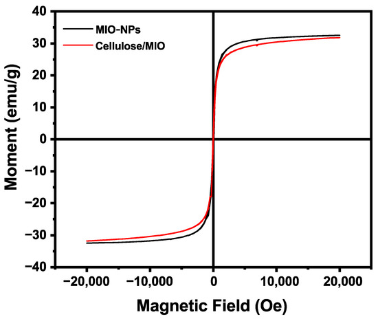 Magnetic property is an important feature of a magnetic material. In this study, the magnetic characteristics of magnetically separated nanomaterials were measured in a field of 20,000 to −20,000 at room temperature by VSM analysis. The hysteresis loops of the MIO-NPs and cellulose/MIO-NCPs are shown in Figure 9. The saturation magnetization (Ms) is the maximum magnetic response of a material in the presence of an external magnetic field [10], which can be useful in the measurement of magnetic properties. In this experiment, the value of Ms for the MIO-NPs (32.43 emu/g) was comparatively higher than that of the cellulose/MIO-NCPs (31.83 emu/g), which was due to the strong interaction between the cellulose particles and MIO-NPs and the use of non-cellulosic raw material during the preparation of the NCPs. The findings of the present work comply with the behavior reported by Rabbi et al. [10], Azizi [14], and Zhu et al. [40] while studying the magnetic property of this nanomaterial. However, the decreasing value of Ms also indicated that the cellulose/MIO-NCPs possessed weaker magnetic properties than the MIO-NPs. For both the NPs and the NCPs, almost zero coercivity and the S-shaped reversible magnetization curve were noticed, confirming the existence of the paramagnetic nature of the synthesized nanomaterials [2,41].