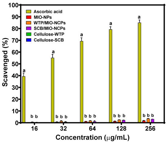 The findings of the DPPH assay indicated that the cellulose-WTP and cellulose-SCB did not show any scavenging activity, while the WTP/MIO-NCPs, SCB/MIO-NCPs, and MIO-NPs exhibited almost negligible antioxidant activity in comparison to ascorbic acid. In addition, no significant difference (p-value ≤ 0.05) was noticed between the MIO-NPs, the WTP/MIO-NCPs, and the SCB/MIO-NPs. In a study, Rabbi et al. [8] showed that neither cellulose particles obtained from jute fiber nor MIO-incorporated cellulose particles exhibited antioxidant activity due to their identical behavior, and the antioxidant capacity of MIO-NPs could hardly be observed due to their negligible % scavenged value, which complies with our findings.