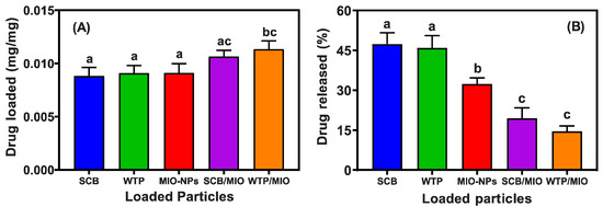 (A) Amount of drug-loading and (B) drug-releasing efficiency of cellulose (SCB and WTP), MIO-NPs, SCB/MIO-NCPs, and WTP/MIO-NCPs. Similar letters above bars indicate no significant differences at p-value ≤ 0.05.