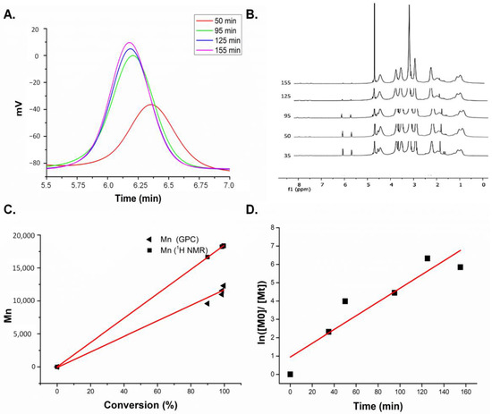 Evolution of GPC chromatograms of sulfobetaine at different times of RAFT polymerization acquired from LS detector (concentrations of all samples were identical in GPC analyses). (A) 1H NMR spectrum of sulfobetaine at different times. (B) Relationship between molecular weight and monomer conversion of sulfobetaine polymerizations. (C) Kinetics of RAFT polymerization of sulfobetaine (D).