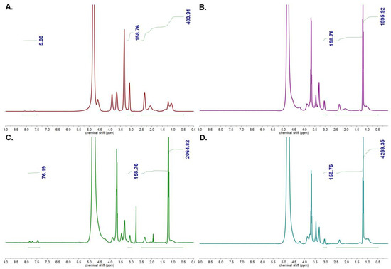 In the peptide conjugated CCMs’ (PC2) 1H NMR spectrum, shown in Figure 2C, besides the peaks belonging to the structure of the CCMs, new peaks were obtained at 1.46, 7.46, 7.71, and 7.85 ppm. While the signals of CTA end groups were not seen in the 1H NMR spectrum of CCMs, due to its high molecular weight, these aromatic signals were seen at 7.46, 7.71, and 7.85 ppm in the spectrum of peptide-bound CCMs originating from the tryptophan, tyrosine, and proline amino acids of the peptide. Similarly, Jie et al. synthesized LTVSPWY peptide-modified magnetic nanoparticles and showed benzene protons in the tryptophan and tyrosine units at 8.32 ppm [36]. In the 1H NMR spectrum of antibody-conjugated CCMs shown in Figure 2D, amine-related peaks were not observed clearly. However, we noticed that signals of -CH2CH2SO3− of SBMA side chain were overlayed at 2.96–3.13 ppm in the 1H NMR spectra of macroCTA, CCMs, peptide conjugated CCMs, and antibody-conjugated CCMs, which are shown in Figure 2A–D. When the integration of -CH2CH2SO3− of SBMA side chain is calculated using RAFT end group signal set to be 5, which is shown at 7.49–8.20 ppm from macroCTA’s 1H NMR spectrum, the integration peak corresponding to the SBMA signal was calculated to be 158.76 (equivalent to 2H from the group). Then we set the 2.96–3.13 signal as 158.76 for CCMs, antibody-conjugated CCMs, and peptide-conjugated CCMs, the integration of polymer backbone peaks, which was shown at 0.5–2.5 ppm in CCMs, peptide conjugated CCMs, and antibody conjugated CCMs (AC3) were 1595.92, 2064.82, 4269.35, respectively. This shows that this increase in integration in the polymer backbone is due to the binding of the peptide and antibody to the carboxyl group at the end group of the micelle, which also confirmed the conjugation of peptide and antibody to the micelles. All AC1–AC5 and PC1–PC5 series’ 1H NMR spectra are given in Figure S1 and Figure S2, respectively.