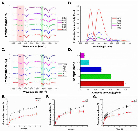 (A) FTIR spectra of PC1-5 and CCMS. (B) Excitation and emission spectrum of peptide conjugated PCs. (C) FTIR spectrum of AC1-5 and CCMS. (D) Antibody amount of ACs. (E) Release graph of micelles. (F) Peptide conjugated micelles. (G) Antibody conjugated micelles.