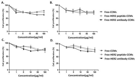 Cytotoxic effect of drug-free CCMs, HER2-peptide and HER2-antibody CCMs (0–100 µg/mL) on 48 and 72 h SKBR-3 breast cancer (A: 48 h; B: 72 h) and MCF-10A (C: 48 h; D: 72 h) cells.
