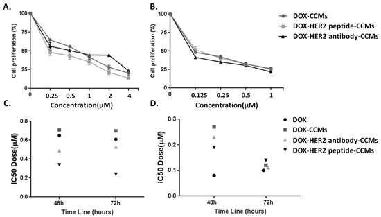 DOX-CCMs, DOX-HER2 peptide-CCMs, and DOX-HER2 antibody-CCMs (0–4 µM) on 72 h SKBR-3 breast cancer (A) and (0–1 µM) cytotoxic effect on MCF-10A (B) cells and SKBR-3 (C) and MCF-10A (D) IC50 dose distribution of cells at 48 and 72 h.