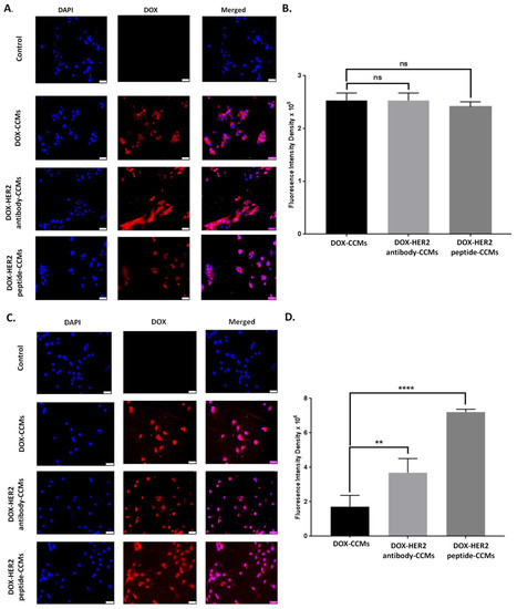 Fluorescence images and fluorescence intensity density of DOX-loaded HER2-peptide CCMs and HER2-antibody CCMs on MCF-10A (A,B) and SKBR-3 (C,D) cells at 48 h, Magnification: 20×, Blue: DAPI; Red: DOX. All experiments were tested and analyzed in triplicate, and repeated three times with similar conditions and paired t-test was performed for statistical analysis, and p < 0.01:**; p < 0.0001:**** were considered significant for 10 different image sections. The error bars represent the standard deviations. Non-significant was shown as ns.