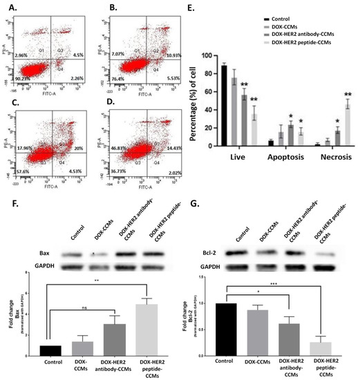 The apoptotic effects of the control (A), IC50-loaded DOX molecule-loaded (B), DOX-loaded HER2-peptide CCMs (C), HER2-antibody CCMs (D) with Annexin V/PI double staining and protein expression level of Bax (F) and Bcl-2 (G) with Western blotting on the SKBR-3 breast cancer cells after 48 h of incubation. (E) Percentage (%) of live, apoptotic, and necrotic cells after treatment with DOX-CCMs, DOX-HER2 antibody CCMs, and DOX-HER2 peptide CCMs. Note that, these experiments were performed in triplicate and repeated three times under similar conditions, and paired t-test was performed for statistical analysis, and p < 0.05:*, p < 0.01:**, and p < 0.001:*** were considered significant. Non-significant was shown as ns.