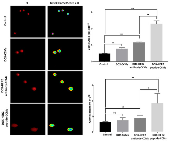After cytotoxic, apoptotic and cytostatic assays, the genotoxic effect of DOX-CCMs, DOX-HER2 peptide-CCMs, and DOX-HER2 antibody-CCMs were demonstrated by comet assay [67].