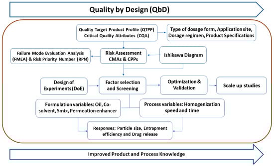 QbD promotes designing formulations for quality, rather than testing them. Quality control evaluation on manufactured products cannot achieve high quality without knowing the material type, the processes involved, or the quality attributes. The quality target product profile (QTPP) is a detailed description of the product’s safety and efficacy standards. Critical quality attributes (CQAs) were chosen to regulate the required features of the desired finished product in order to meet QTPP. The patient should be considered as the first priority while deciding the CQAs of the formulation. QTPP and CQAs were chosen based on research and knowledge of topical lipidic formulations before optimizing API-loaded nano-emulgel [33].