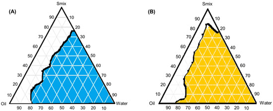 Oil [peceol and geleol (70:30)], surfactant (labrasol), and co-surfactant (capryol 90) were screened based on data obtained from the solubility. Furthermore, the water titration method was used to generate the pseudoternary phase diagram in order to determine the micro-emulsion area [31]. Surfactant and cosurfactant mixture (Smix) were prepared in 1:1 and 2:1 ratios. After that, the 1:9 to 9:1 ratio of oil and Smix mixtures were prepared for 1 g. All of the prepared ratios were thoroughly mixed and titrated with water while continuously mixing, and any turbidity was inspected. The pseudoternary phase diagrams were plotted using Triplot 4.1.2 software based on the obtained percentage components.