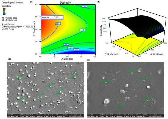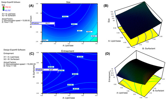Design-Expert software was used for the optimization, data analysis, and model validation to fit the experimental data into quadratic polynomial models for estimating the examined responses, as well as the inspected variables. The coefficient of correlation (R) and lack of fit analysis were chosen to serve as model assessment parameters from a variety of metrics. After that, the coefficients with p < 0.001 were considered when testing the analysis of variance (ANOVA) model. Furthermore, both three-dimensional response and two-dimensional counter plots were utilized in order to explore the factor response relationship. Based on the numerical optimization and desirability function, the best suggested composition was chosen. This is accomplished by switching the different CQA, i.e., desirable size, and maximizing the percentage entrapment of the drug in the formulation.