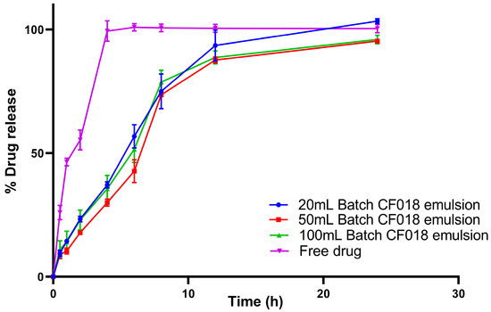 In the centrifugation test, the optimized CF018 emulsion (1 g) was diluted to 10 mL with water and allowed to undergo centrifugation at 5000 rpm for 15 min (REMI CPR-24) and assessed for instability. For the freeze–thaw stability, the temperatures were maintained to be −21 °C for 24 h followed by +25 °C for three cycles. Additionally, the formulation was subjected to three heating–cooling cycles. The temperature for the cooling cycle was 4 °C, and it was 45 °C for more than 48 h, as designed for the heating cycle [40].