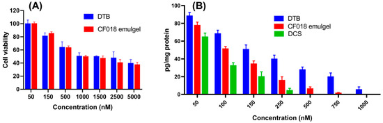The cytotoxicity of the CF018 emulgel was examined using HaCaT (human keratinocyte) cell lines. The cell growth medium was composed of 90% Dulbecco’s modified eagle’s medium (DMEM) and 10% fetal bovine serum (FBS). The MTT [(3-(4, 5-dimethyl thiazolyl-2)-2, 5-diphenyltetrazolium bromide)] test was used to investigate cell cytotoxicity. The number of viable cells in the cell suspension was determined using a hemocytometer and the trypan blue exclusion method. For the test, 5 × 103 cells/ well in a 96-well plate were seeded and placed into each well of a 96-well culture plate for 24 h in a CO2 incubator at 37 °C with 5% CO2 saturated humidity. The following day, medium was replaced with suspension of free DTB and CF018 emulgel prepared in 10 mL of DMEM medium. Each suspension was added at different concentrations of 50, 100, 150, 250, 500, 750, 1000, 1500, 2500, and 5000 nM. After 48 h, the medium containing the suspensions was discarded, followed by a PBS wash and an MTT test. To assess the viability of the cells, the absorbance was measured at 570 nm with a reference wavelength of 630 nm using an ELISA microplate reader (Biotek, Winooski, VT). The experiments were carried out in triplicate, and the results were expressed as the means ± SDs [45].