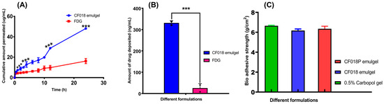 Optimized CF018 emulgel formulation and the free drug-loaded gel (FDG) comparative permeation studies were conducted. The study was carried out in fabricated Franz diffusion cells (1.7 cm2 area and volume 30 mL), using rat skin. The skin was isolated and placed between the donor and acceptor compartment of Franz diffusion cells, placing the dorsal side upward. Phosphate buffer, pH 5.5, containing 1% Triton X100 as a release medium at 37 ± 0.5 °C under continuous stirring at 400 rpm was used throughout 24 h. A 1 mL sample was withdrawn at each predetermined time point and replaced with an equal amount of fresh medium. The sample was analyzed by HPLC at 320 nm after suitable dilution [46].