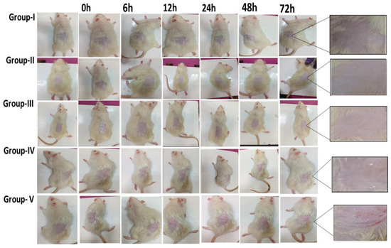 In vivo skin irritation study of Group I—untreated group; Group II—FDG (200 mg from 0.05% gel); Group III—CF018 emulgel (200 mg from 0.05% gel); Group IV—CF018P emulgel (200 mg from 0.05% gel); Group V—received 5% SLS gel.