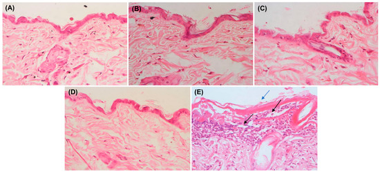 Histopathology of skin sample after skin irritation studies. (A) Group I—untreated group. (B) Group II—FDG (200 mg from 0.05% gel). (C) Group III—CF018 emulgel (200 mg from 0.05% gel). (D) Group IV—CF018P emulgel (200 mg from 0.05% gel). (E) Group V—received 5% SLS gel [Note (→) Indicates hyperkeratosis (→) Necrosis].
