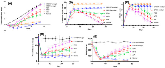 During the FCA immunization experiment period, rats lost significant weight (p < 0.05–p < 0.001), as depicted in Figure 13A. Meanwhile, significant weight gains (p < 0.001) were observed in animals treated with MFD, CF018 emulgel, and FDG after the 27th day. The CF018 emulgel resulted in a significant (p < 0.5) improvement in body weights when compared to topical FDG administration; however, a similar difference was observed in the MFD-treated group. The results showed that the CF018 emulgel formulation was more effective, with a significant weight gain beginning on the 12th day (p < 0.05). On the fifth day, FCA-injected hind paws swelled to maximum and converted to red (first phase). After that, the swelling subsided until the 10th day. Disseminated arthritis caused the paw to swell again (second phase), worse than before (first phase). Topical CF018 emulgel and MFD from the 5th day of arthritis induction suppressed (p < 0.01) the second phase (Figure 13B) and reduced hind paw edema/redness in the arthritis groups. As depicted in Figure 13C and Figure 14, the arthritic clinical score decreased significantly from day 15–27 (p < 0.05), indicating anti-arthritic activity. Compared to the AIA control group, the blank formulation did not affect body weight change, paw swelling, or arthritic score.