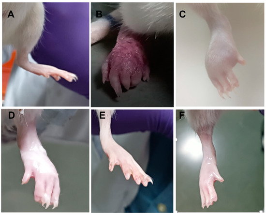 Representative images of FCA injected hind paws after 28 days of treatment with various formulations: (A) normal; (B) AIA; (C) CF018P emulgel; (D) FDG; (E) CF018 emulgel; (F) MFD.