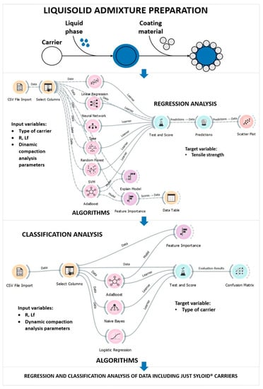 In order to analyze the properties of LSS during compaction, a new data set was obtained by varying the compression load at 6 levels ranging from 250 to 500 kg with a 50 kg increment for each of the 25 compressed admixtures (marked with * in Table 1). The data set consisted of 9 variables with 150 entries each. The type of carrier used was defined as a categorical variable, while the remaining 8 variables were numerical and included the formulation factors R and Lf, as well as TS, CP, DS, ES, NWC, and ER. TS was chosen as the target variable, while the influence of the other variables on TS was investigated. A visual representation of the proposed methodology can be found in Figure 1.