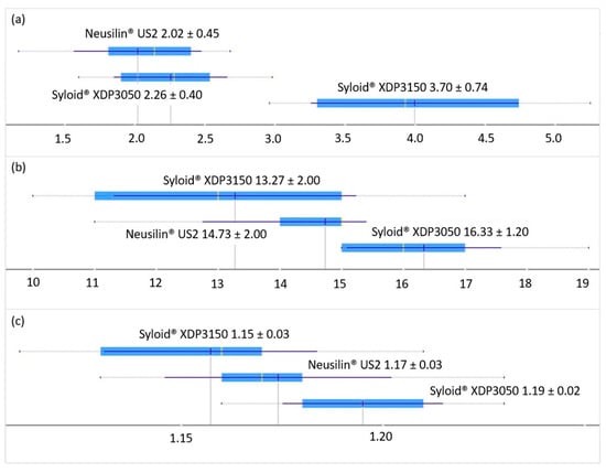 Based on the values of CI and HR and their corresponding descriptive terms proposed by the European Pharmacopoeia, the flowability of admixtures with Syloid® XDP 3150 and Neusilin® US2 carriers was described as good, and the flowability of admixtures with Syloid® XDP 3050 was described as acceptable [47].
