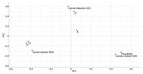 In order to better understand the mutual dependence of different parameters (type of carrier used, R, Lf, flow rate, CI, and HR), multivariate data analysis was carried out using the principal component analysis (PCA). By applying this method, the number of data points is reduced by defining “principal components,” (PC) which, among other things, take into account the maximum variance originating from each of the variables [66]. The results of the PCA analysis are shown in Figure 3. It was noted that the first principal component (PC1) was able to explain approximately 41% of the variance and correlated to a higher degree with the 4 input variables (flow rate, CI, HR, and Syloid® XDP 3150 carrier), with a positive correlation in the case of Syloid® XDP 3150 carrier and flow rate and a negative one in the case of CI and HR, indicating that admixtures with carrier Syloid® XDP 3150 achieved better flowability. The second principal component (PC2) was able to explain approximately 29% of the variance and was positively correlated with the carrier Neusilin® US2 as well as with the Lf, which was a result of LS formulations with this carrier having the highest amount of liquid phase incorporated within them.