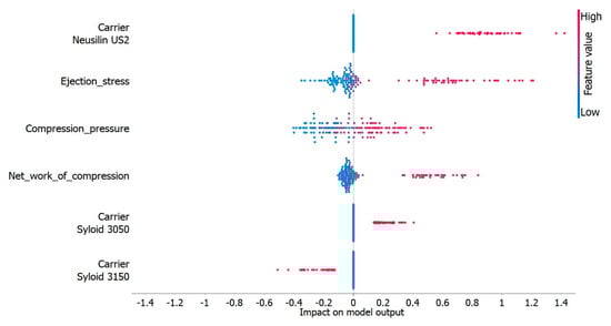 The carrier type was the variable with the most notable impact on the model output, and further explanation of the model by the appropriate software features singled out carrier Neusilin® US2 as the variable with the greatest impact (Figure 6). LS compacts containing this carrier achieved TS values that ranged from 1.65 to 4.34 MPa. According to the literature, data compacts with TS values higher than 1 MPa are acceptable [68]. LS compacts with the other two carriers achieved noticeably lower values of TS, 0.40 to 1.10 MPa and 0.50 to 2.00 MPa, for admixtures with Syloid® XDP 3150 and Syloid® XDP 3050, respectively. These results are in line with what has been reported in the literature. In a study investigating different mesoporous carriers, Mura et al. [62] compared the tablet crushing force of compacts prepared under the same conditions. With a value of 332.6 N, Neusilin® US2 displayed superior compaction properties compared to Syloid® XDP 3150 (tablet crushing force of 13.4 N). Due to its high absorption capacity, Neusilin® US2 has been widely used as a carrier in lipid-based drug delivery systems as well. Gumaste et al. [69] reported that Neusilin® US2 was able to absorb the lipid component of the formulation at a ratio of 1:1 and still retain a TS higher than 1 MPa despite the type of liquid used or CP applied (45–270 MPa). Despite the highest liquid load, the TS of the LS compacts with Neusilin® US2 was the highest of the three carriers tested. These findings highlighted the importance of selecting a carrier with suitable characteristics, such as a high SSA, and indicated that the properties of the carrier itself were largely responsible for the behavior of LSS during compaction, while other formulation factors contributed less. These results also highlight Neusilin® US2 as the carrier that exhibits both good flowability and good compressibility while retaining large amounts of the liquid phase.