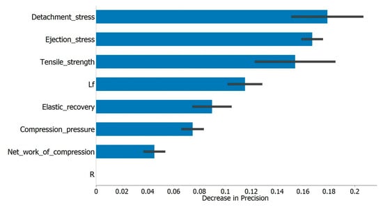 The influence of tested variables on classification model’s output (presented as the decrease in precision that removing a variable would cause).