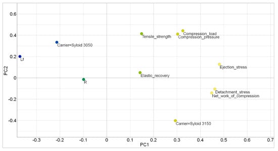 The differences between the two carriers could not be observed graphically by displaying the dependence of TS on one of the tableting process parameters. This led to data analysis using PCA, which allowed a clear division between the two carriers and managed to explain approximately 65% of the variance (~39% was explained by PC1 and ~26% was explained by PC2). The positive correlation between carrier Syloid® XDP 3050 and Lf, which were both negatively correlated with PC1 was observed (Figure 7). On the other hand, higher values of PC1 indicated a sample that achieved higher values of DS, ES, and NWC and contained Syloid® XDP 3150 as a carrier. Following PC2, a positive correlation between Syloid® XDP 3050 and TS was also observed (Figure 8). From these results, it was concluded that Syloid® XDP 3150 had slightly worse behavior during compression and that compacts with this carrier achieved higher values of DS, ES, and NWC and lower values of TS.