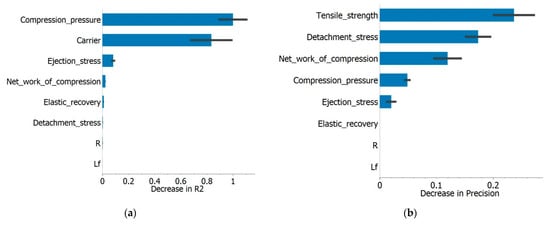 Analysis of differences in compaction properties between Syloid® carriers: (a) The influence of tested variables on regression model’s output with tensile strength as dependant variable (presented as the decrease in coefficient of determination that removing a variable would cause).; (b) The influence of tested variables on classification model’s output (presented as the decrease in precision that removing a variable would cause).