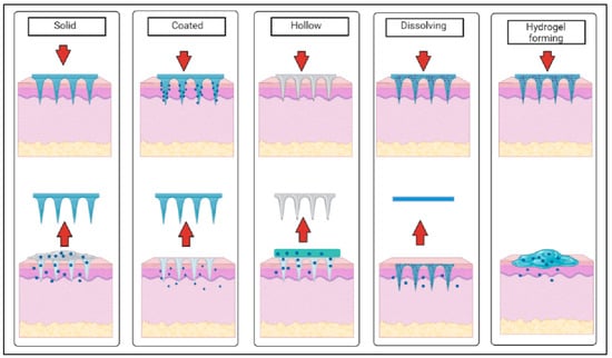 There are five main types of microneedles: solid, hollow, dissolving, coated and hydrogel-forming. Each type of microneedle array has a different mechanism of action after application on the skin [], as shown in Figure 2 below.