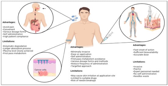 Other routes of administration for cancer drug delivery include oral delivery or the use of ointments and topical creams, especially in skin cancer. Oral delivery of cancer drugs (e.g., capecitabine, trifluridine, regorafenib and fluoropyrimidines) are also not suitable and have multiple disadvantages compared to microneedles due to the complex biological environment and internal conditions with pH variability and the presence of enzymes [,,]. Numerous drugs often suffer from poor absorption caused by drug degradation resulting from the first-pass metabolism in the gastrointestinal route and microenvironment changes in pH, food, etc. []. Topical creams and ointments such as 5-fluorouracil, imiquimod, resiquimod, ingenol and retinoids also often cause skin irritations. They also show less bioavailability due to the biodegradation in the body and the permeability of the skin, which acts as a barrier towards certain drug molecules []. The stratum corneum only shows significant permeability for low molecular weight drugs and lipophilic drugs []. Comparatively, microneedles have a faster drug action due to direct release for absorption in systemic circulation []. Figure 3 shows the comparisons between microneedles and other conventional drug delivery methods involved in cancer treatments using various routes of administration.