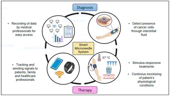 Researchers are also constantly trying to design and construct smart microneedle systems, such as a microneedle patch that is embedded with biosensors and has wearable applications or tattoo-based application. This system would be able to offer a multifunctional approach that would bring cancer therapy to a whole new level. This could also allow the transmission of personalized health data wirelessly, as well as achieving personalized diagnostics through telemedicine and cloud medicine []. The biomaterials in a smart microneedle system can be specifically designed to be sensitive to a specific stimulus present in the tumor microenvironment, e.g., temperature, pH, the wavelength or intensity of incident light or an electrical or magnetic field; and to then respond in active ways including changing their structure for drug delivery, radioprotection, priming an immune response, or other functions that have the potential to enhance cancer diagnosis and therapy []. The delivery of drugs through the microneedles could also be monitored, and this would greatly aid family members and medical practitioners to keep track of the conditions of the patients. This system could also be adapted as a blockchain system in future medical care to allow easy transmission of health data with traceability and trackability features which could also maintain more transparency and avoid any problems that may arise. Figure 4 shows the schematic diagram of a smart microneedle system which would greatly benefit future cancer therapy.