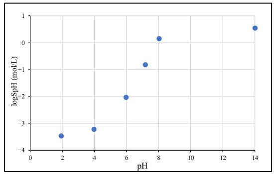 The pH-dependent solubility (SpH) of ibuprofen was tested at 5 different pH values in the pH 2–8 range using BR buffer solutions. Additionally, the solubility of the fully ionized form was determined in 1M NaOH solution. The results obtained are summarized in Table 3, and the solubility/pH profile is shown in Figure 2.