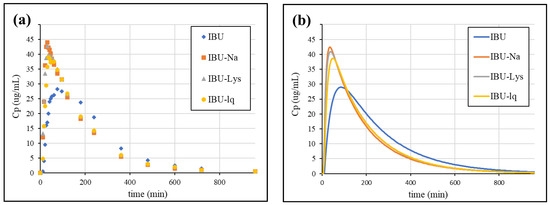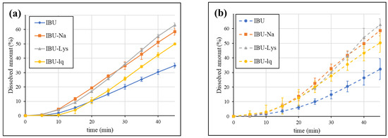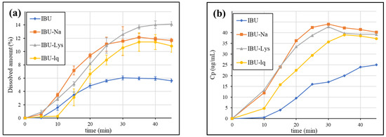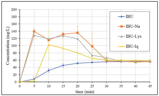 Based on the dissolution profiles of Figure 6a, the effect of gastric supersaturation results in a higher dissolved amount in the duodenum as well. All three rapid-release products reach a higher maximum concentration compared to the standard IBU formulation, which is consistent with the in vivo results. The plateau of IBU-Lys is slightly higher than that of IBU-Na and IBU-lq, which, however, was not experienced in vivo. It should be noted, though, that the formulations containing ibuprofen-lysinate salt tested in the in vitro and in vivo studies came from different manufacturers. In the case of IBU-lq, the delay in the onset of dissolution experienced in the gastric chamber persists in the duodenum and also appears in vivo.