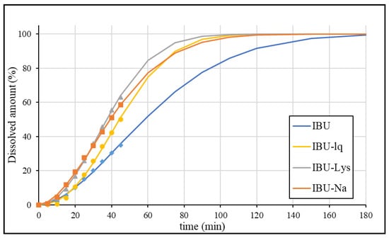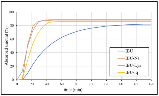 Based on Figure 10, the calculated curves fit the experimental data well, however, extrapolation is required to describe the whole dissolution profile. Therefore, this phase of the profiles has a greater uncertainty. Comparing the in vitro (Figure 10) and the in vivo (Figure 9) data, it appears that there is a slightly greater difference in the absorption rate between IBU and the rapid-release formulations than in the observed dissolution rate.