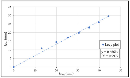 The in vitro dissolution (from Weibull fitting) and the in vivo absorption (from deconvolution) of IBU were correlated using the Levy plot. The times corresponding to nominally the same dissolution (tVitro) and absorption (tVivo) were plotted, and the relationship was estimated using linear regression. The Levy plot is presented in Figure 11.