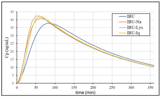 The simulated plasma concentration profiles of ibuprofen formulations.