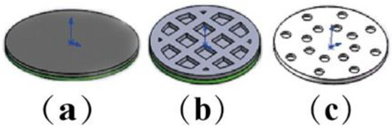 The models of oral films: (a) solid sample, (b) hollow grid, (c) concentric holes.