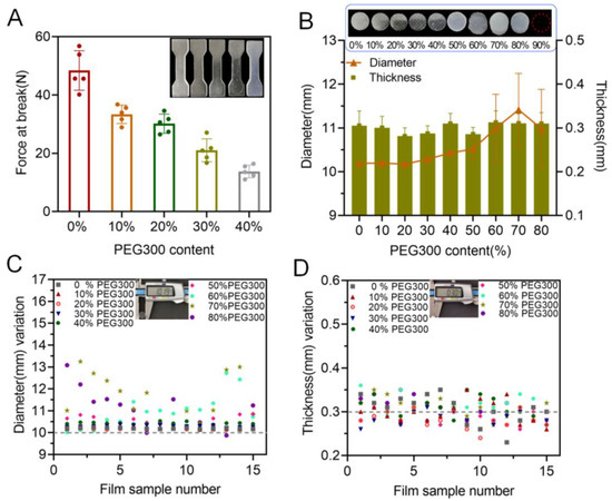 Effect of PEG concentration on printability: (A) effect of PEG content on the tensile strength (n = 6); (B) effect of PEG content on the diameter and thickness of the produced oral films (n = 15); (C) diameter variations of the 3D-printed oral films; (D) thickness variations of the 3D-printed oral films.