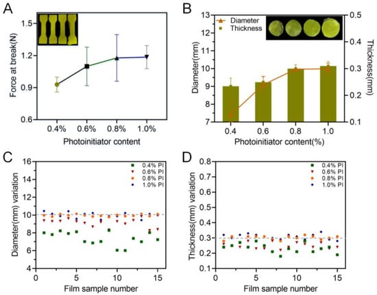 Effect of the photoinitiator on the printability: (A) force at break of specimen samples (n = 6); (B) thickness and diameter of 3D-printed oral film samples (n = 15); (C) diameter variations and (D) thickness variations of 3D-printed oral film samples.