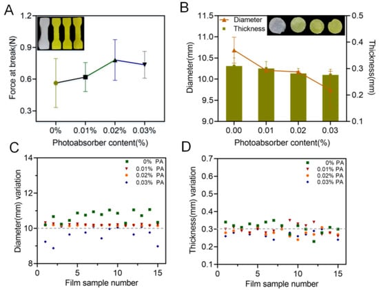 Effect of the photoabsorber on the printability: (A) force at break of specimen samples (n = 6); (B) thickness and diameter of 3D-printed oral film samples (n = 15); (C) diameter variations and (D) thickness variations of 3D-printed oral film samples.