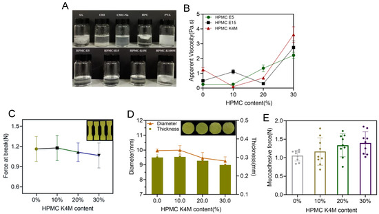 (A) The physical state of adhesive materials mixture; (B) viscosity of the printing resin containing HPMC E5, E15, K4M at different concentrations (n = 6); (C) effect of HPMC K4M on the force at break of 3D-printed oral films (n = 6); (D) effect of HPMC K4M on the thickness and diameter of 3D-printed oral films(n = 15); (E) effect of HPMC K4M on the mucoadhesive force of 3D-printed oral films (n = 6).